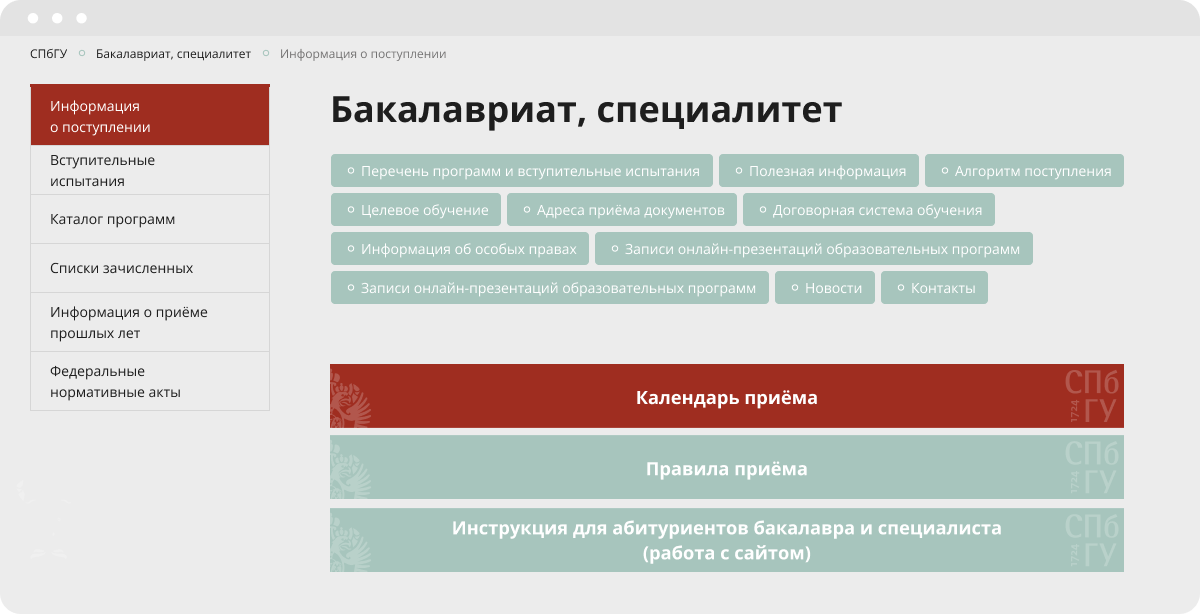 - Улучшение информационной доступности: новый блок позволит легко найти и получить информацию о бакалавриате СПбГУ, не переходя на другие страницы сайта. Это может быть полезно для людей, которые уже знают, что хотят учиться в университете и ищут информацию о конкретных программах.